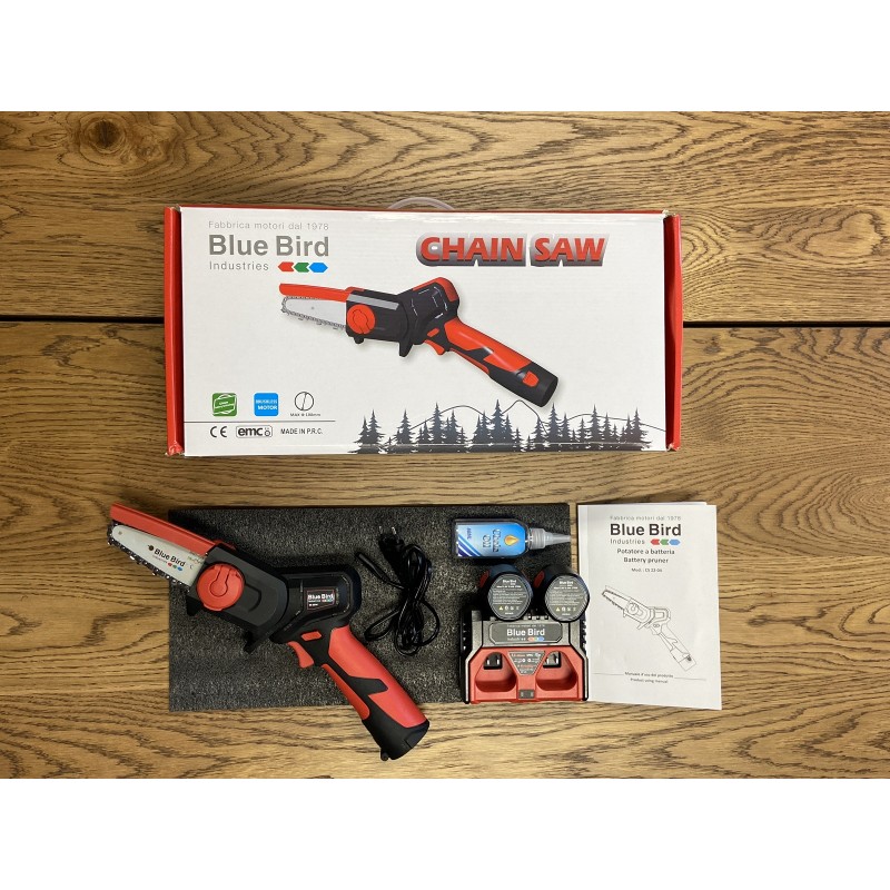 Sécateur électrique à batterie Bluebird adapté à la coupe d’arbustes, de buissons, de branches jusqu’à une taille maximale de 100 mm.